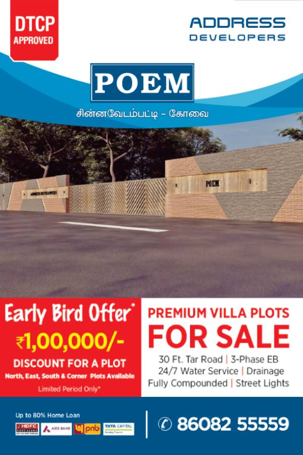 POEM, a premium gated community situated close to Saravanampatti and very near to world class educational institutions. A well-developed location with fast growing IT corridor near by and easy access to Sathy road and Mettupalayam road. The best in place and the fast growth around offers the best investment in the city. Our Project is spread over an area of 1 acres with all the comfort for a premium residential living. Address Developers provides you the perfect layout for a spacious housing society with all the basic amenities that fits into your budget and your lifestyle.